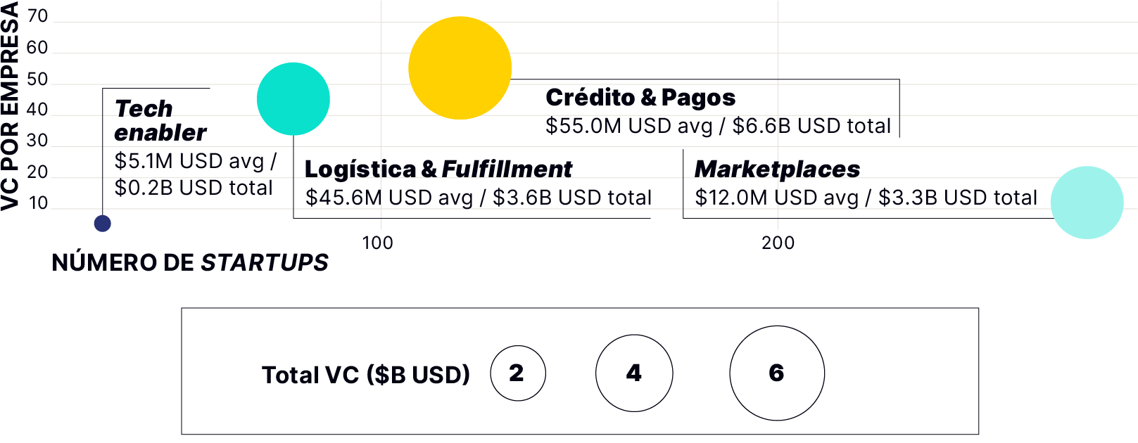 El auge del comercio electrónico se sostiene en verticales estratégicas que habilitan la creación de valor end to end. Crédito y Pagos lidera la inversión de capital de riesgo, con $6,600 millones USD distribuidos entre 120 startups en LATAM, lo que representa una inversión de capital promedio de $55 millones USD por empresa. Le sigue Logística y Cumplimiento, con $3,600 millones USD invertidos en 78 empresas, y un promedio de $46 millones USD por compañía. Ambas capas surgen como esenciales para resolver los cuellos de botella regionales. Los marketplaces, con $3,300 millones USD repartidos entre casi 300 startups ($12 millones USD en promedio), muestran una entorno más fragmentado.